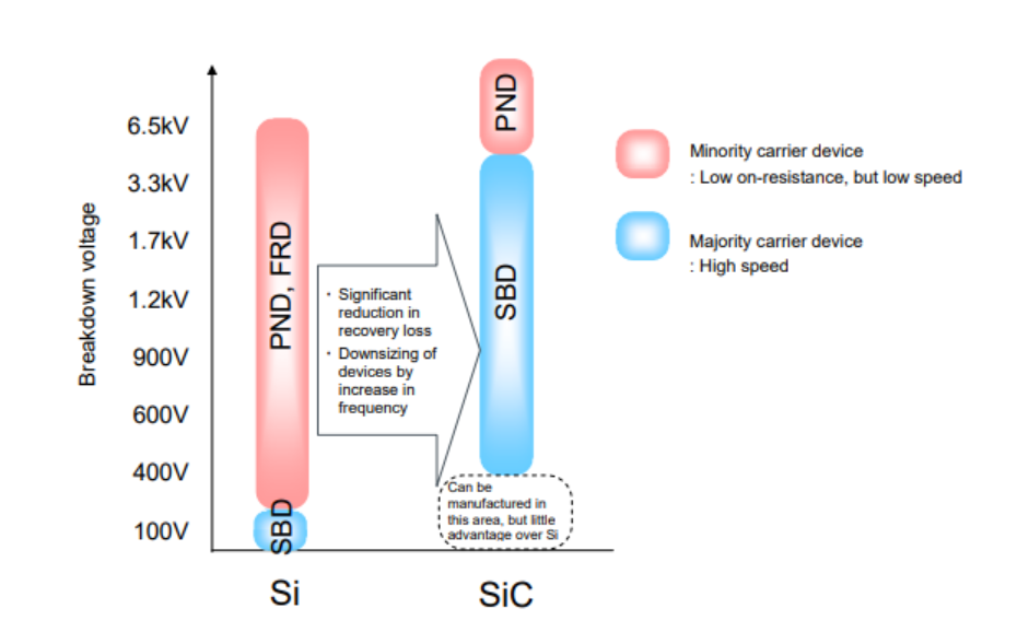 碳化硅制作的器件具有耐高温、耐高压、高频、大功率、抗辐射等特点,具有开关速度快、效率高的优势,可大幅降低产品功耗、提高能量转换效率并减小产品体积,下游应用广泛。目前碳化硅半导体主要应用于以5G通信、国防军工、航空航天为代表的射频领域和以新能源汽车、“新基建”为代表的电力电子领域,在民用、军用领域均具有明确且可观的市场前景。